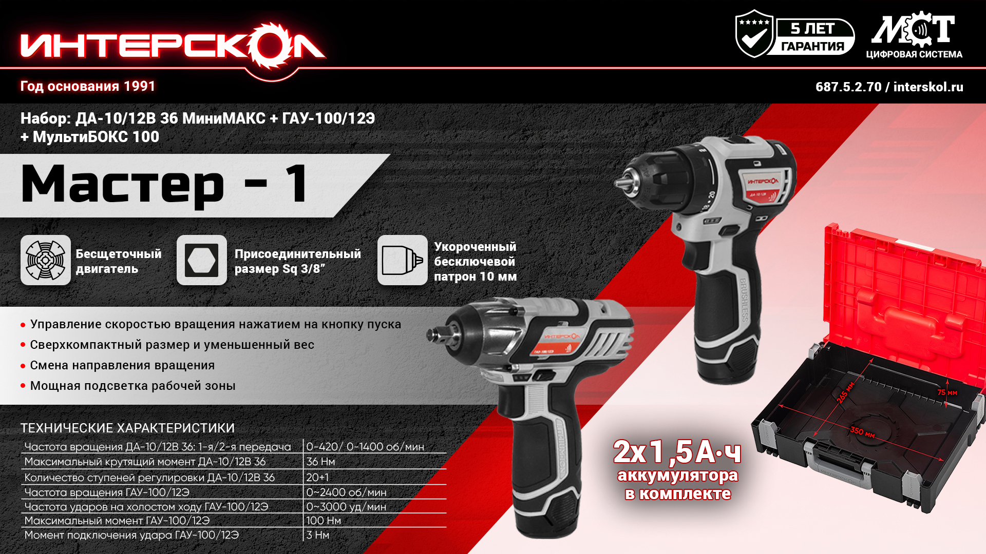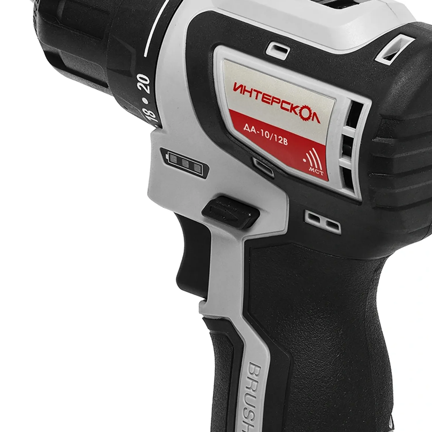 ИНТЕРСКОЛ ДА-10/12В 36 - профессиональная аккумуляторная двухскоростная дрель-шуруповерт, самая компактная в своем классе. Модель с бесщеточным (вентильным) двигателем оптимально сбалансирована по весу, размерам и мощности для больших объемов работ с крепежом, сверления отверстий и выполнения сопутствующих операций. Литийионная (Li-ion) аккумуляторная батарея туннельного типа обеспечивает компактность исполнения, малый вес и большой запас энергии.