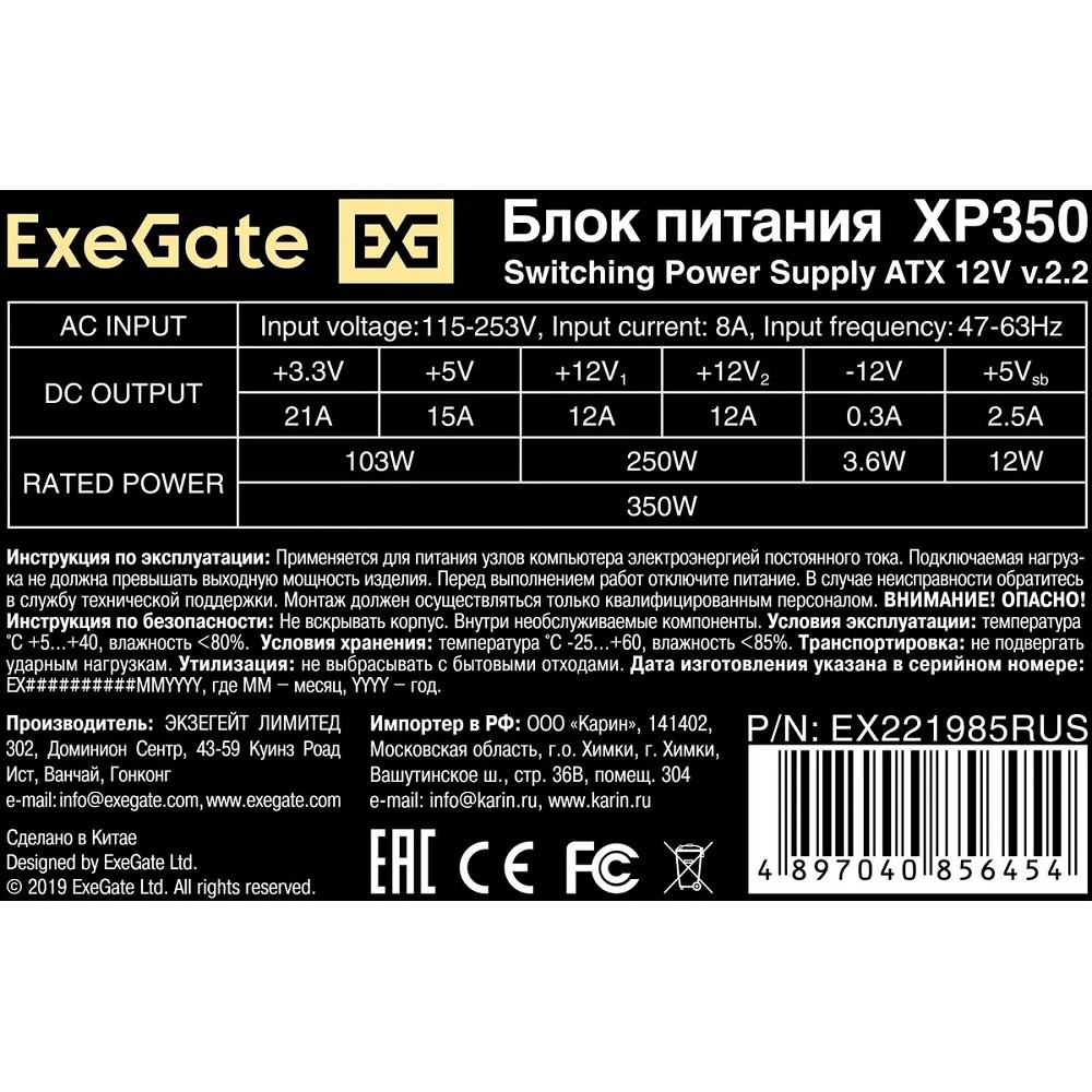 Блок питания ATX-XP350 от компании Exegate.