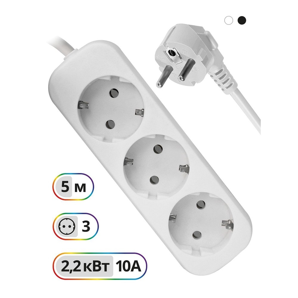 ″Удлинитель электрический на 3 розетки с заземлением. Простой и надежный бытовой удлинитель, который предназначен для электроприборов и использования внутри помещений.Подходит для дома, офиса и коммерческих помещений. Предусмотрена возможность крепления на стену. Длина провода 5 метров. Мощность 2200 Вт. Максимальный допустимый ток 10А. Корпус из негорючего пластика.″