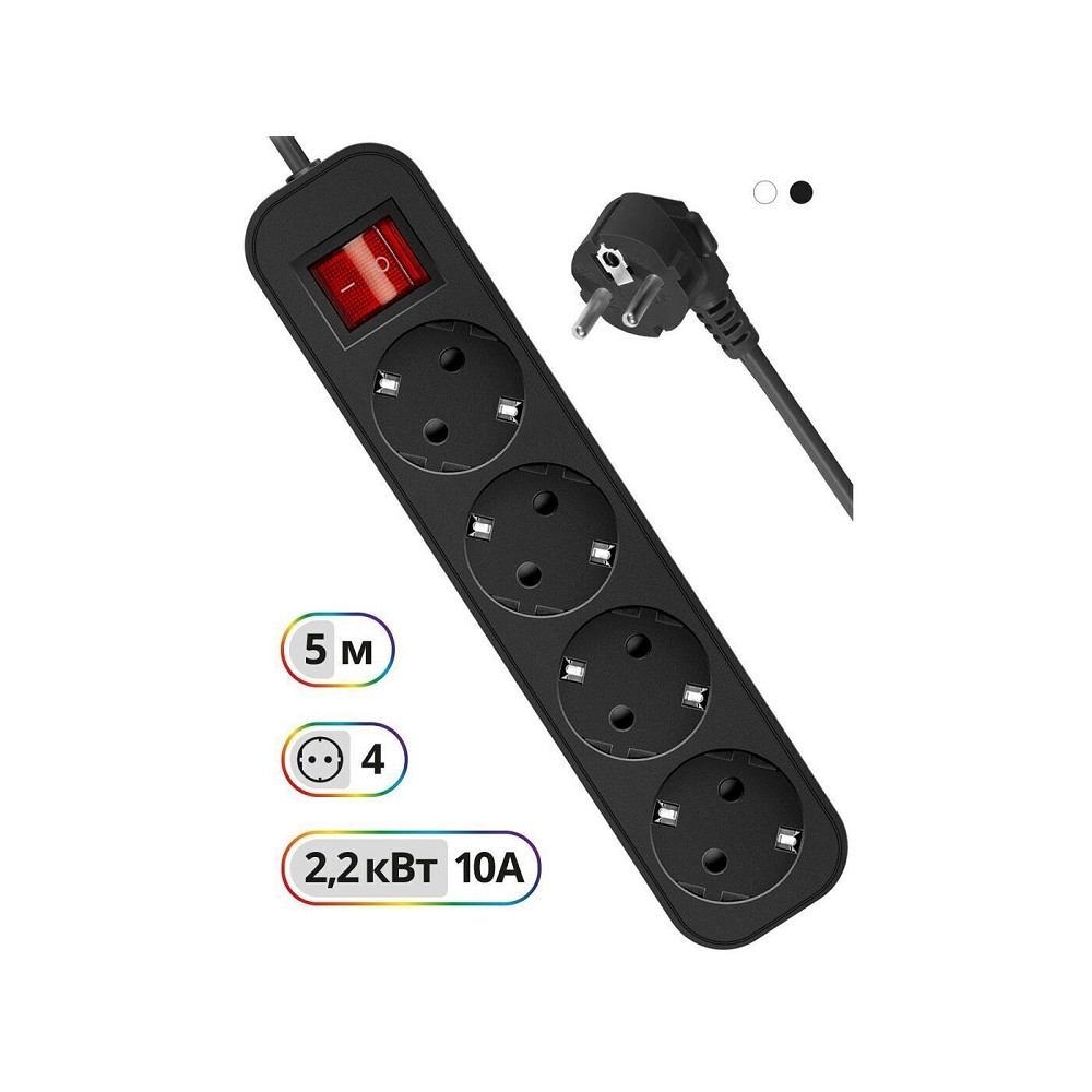 ″Удлинитель электрический на 4 розетки с заземлением.Простой и надежный бытовой удлинитель, который предназначен для электроприборов и использования внутри помещений.Подходит для дома, офиса и коммерческих помещений. Предусмотрена возможность крепления на стену. Длина провода 5 метров. Мощность 2200 Вт. Максимальный допустимый ток 10А. Корпус из негорючего пластика. Индикатор сети. Выключатель питания.″
