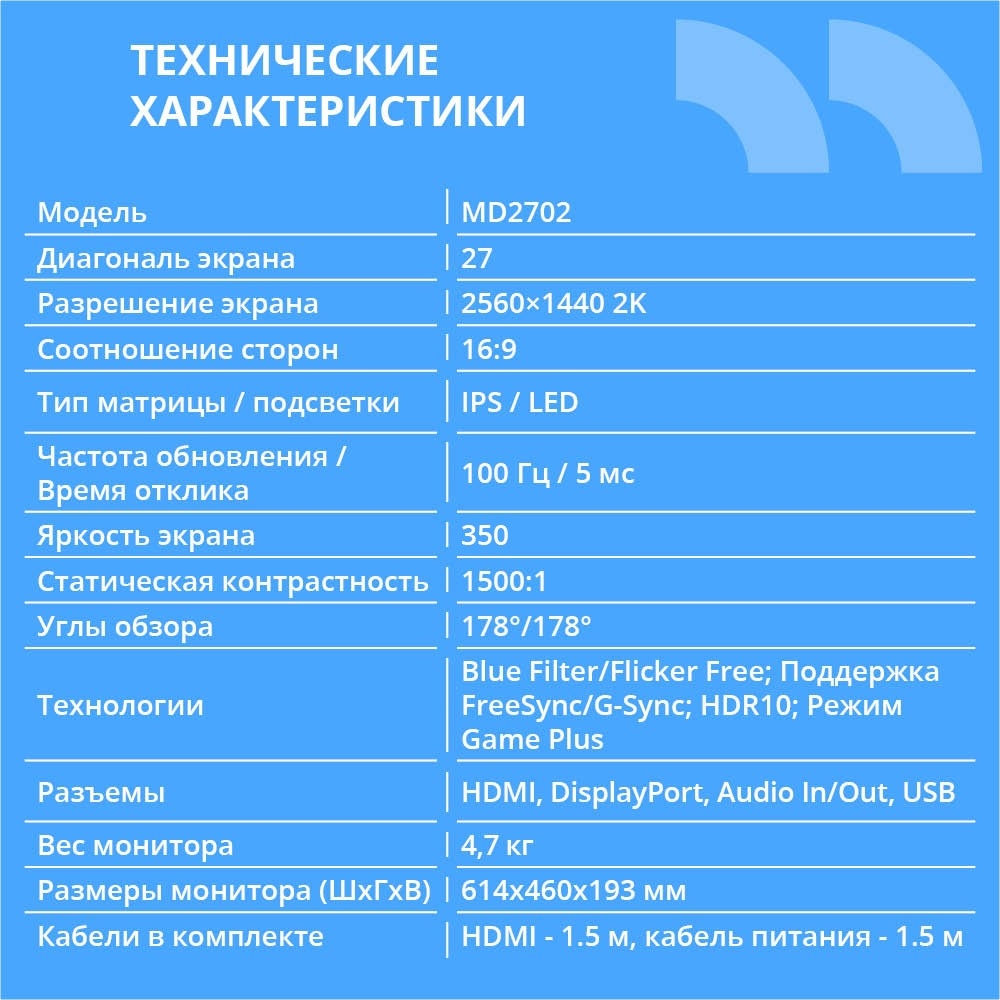 CBR LCD Монитор 27″ MD-2702, IPS, QHD 2K 2560x1440, 100Гц, Динамики 2*3W, HAS, Pivot, 1*DP/1*HDMI, внутренний БП, FreeSync, черный, кабель HDMI 1.5м [LCD-MD2702-OPC]