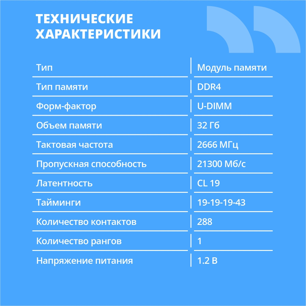 CBR DDR4 DIMM (UDIMM) 32GB CD4-US32G26M19-01 PC4-21300, 2666MHz, CL19, 1.2V — это высококачественная оперативная память для вашего компьютера. Она обеспечивает быструю и эффективную работу системы, позволяя вам наслаждаться высокой производительностью при выполнении повседневных задач и требовательных приложений.Основные характеристики:* Тип памяти: DDR4