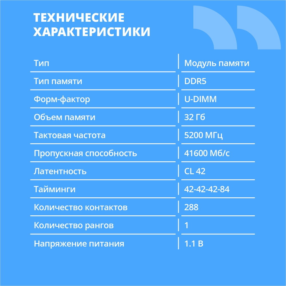 Оперативная память DDR5 DIMM (UDIMM) 32GBОперативная память формата DDR5 DIMM — это надежное и эффективное решение для повышения производительности вашего компьютера. Благодаря высокой скорости передачи данных, она обеспечивает быструю загрузку операционной системы и приложений.Основные характеристики:* Тип: DDR5 DIMM UDIMM