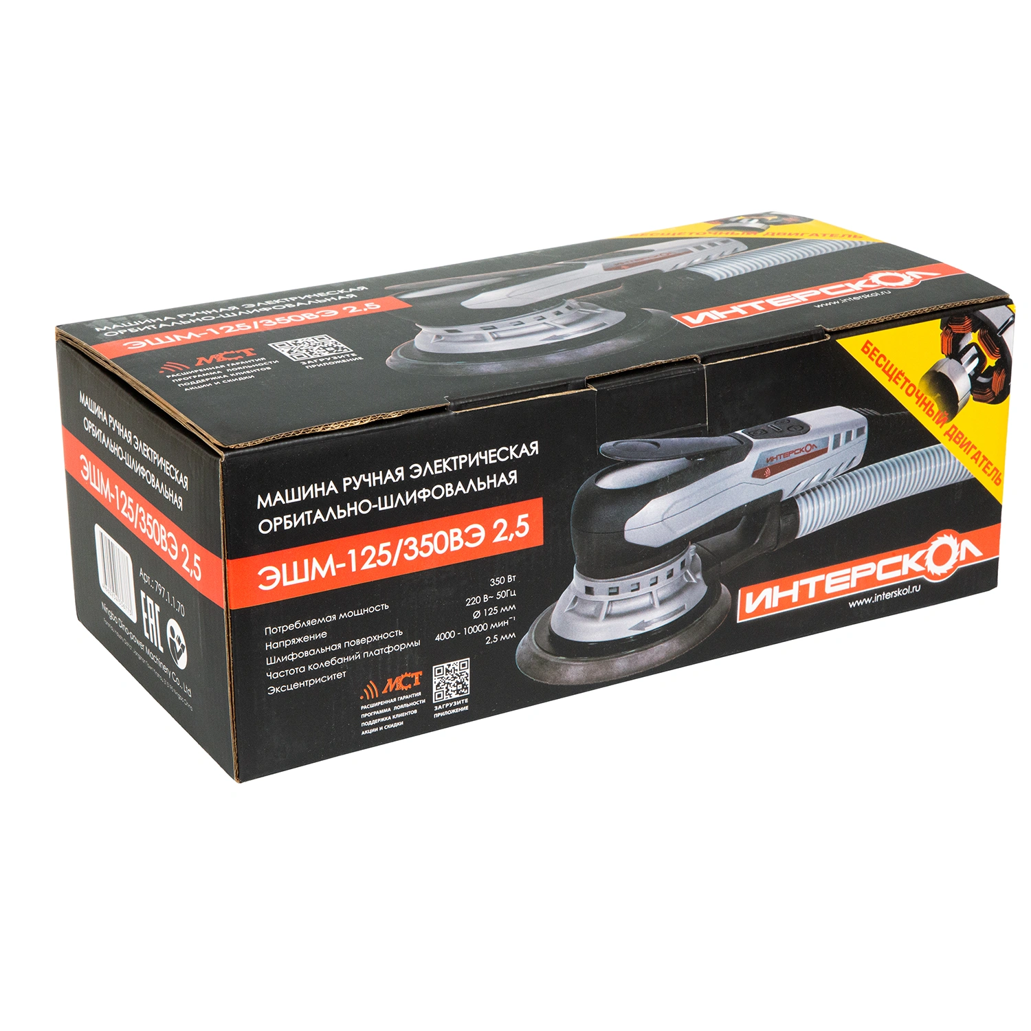 Эксцентриковые профессиональные шлифмашины ИНТЕРСКОЛ ЭШМ-125/350Э и ИНТЕРСКОЛ ЭШМ-125/350Э оборудованы бесщеточным (вентильным) сетевым двигателем, работающим под управлением цифрового электронного блока. Повышенный коэффициент полезного действия двигателя и отсутствие редуктора обеспечивают шлифмашине высокую энергоэффективность и рекордно малый вес. В сочетании со схемой динамической балансировки это снижает массу изделия и позволяет оператору машины эффективно шлифовать длительное время, не уставая. Эквивалентная мощность в пересчете на традиционную схему с коллекторным двигателем и редуктором составляет 500Вт, что достаточно для всех операций эксцентрикового шлифования.
