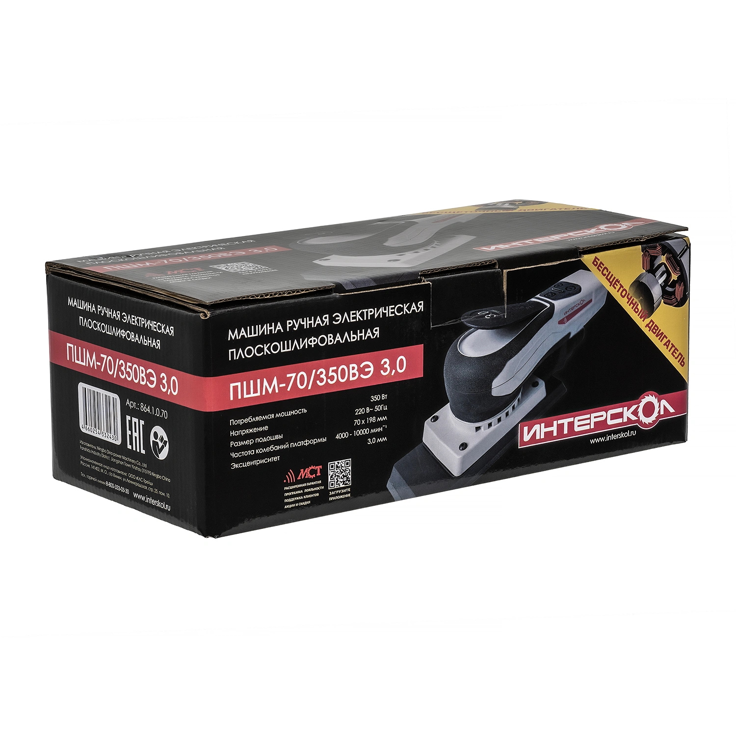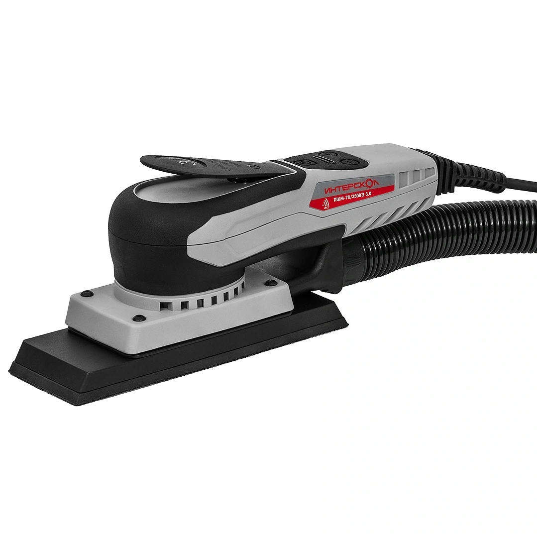 Профессиональные плоскошлифовальные машины ИНТЕРСКОЛ ПШМ-70/350ВЭ 3,0 на основе бесщеточного двигателя номинальной потребляемой мощностью 350 Вт (полезная мощность 300 Вт), работающего от сети 220 В под управлением цифрового электронного блока – это новое поколение современного электроинструмента для решения множества разнообразных задач, включая наиболее сложные. Повышенный коэффициент полезного действия агрегата и возросшая на 30 % энергоэффективность, а также отсутствие редуктора (безредукторная кинематическая схема) в сочетании с системой динамической балансировки обеспечивают малый вес, пониженные уровни шума и вибрации, значительно увеличивая надежность и долговечность машины.