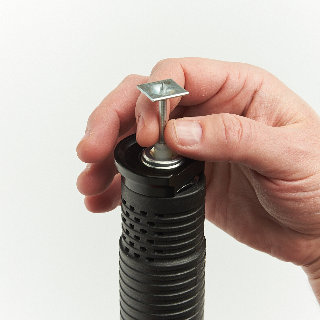 Гвоздь монтажный пироксилиновый — это высокопрочный цельнометаллический дюбель-гвоздь с крепежным элементом в виде квадратной шайбы со стороной 18,5 мм и пироксилиновым (нитроглицериновым) зарядом, специально разработанный для быстрой и безопасной фиксации сеток и тонких материалов. Отличительной особенностью данного крепежа является его работа без использования патронов, что облегчает монтаж в труднодоступных местах.